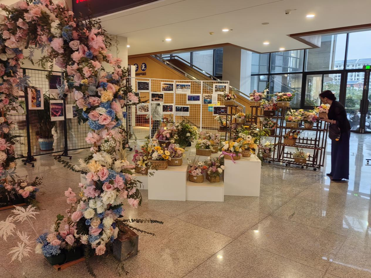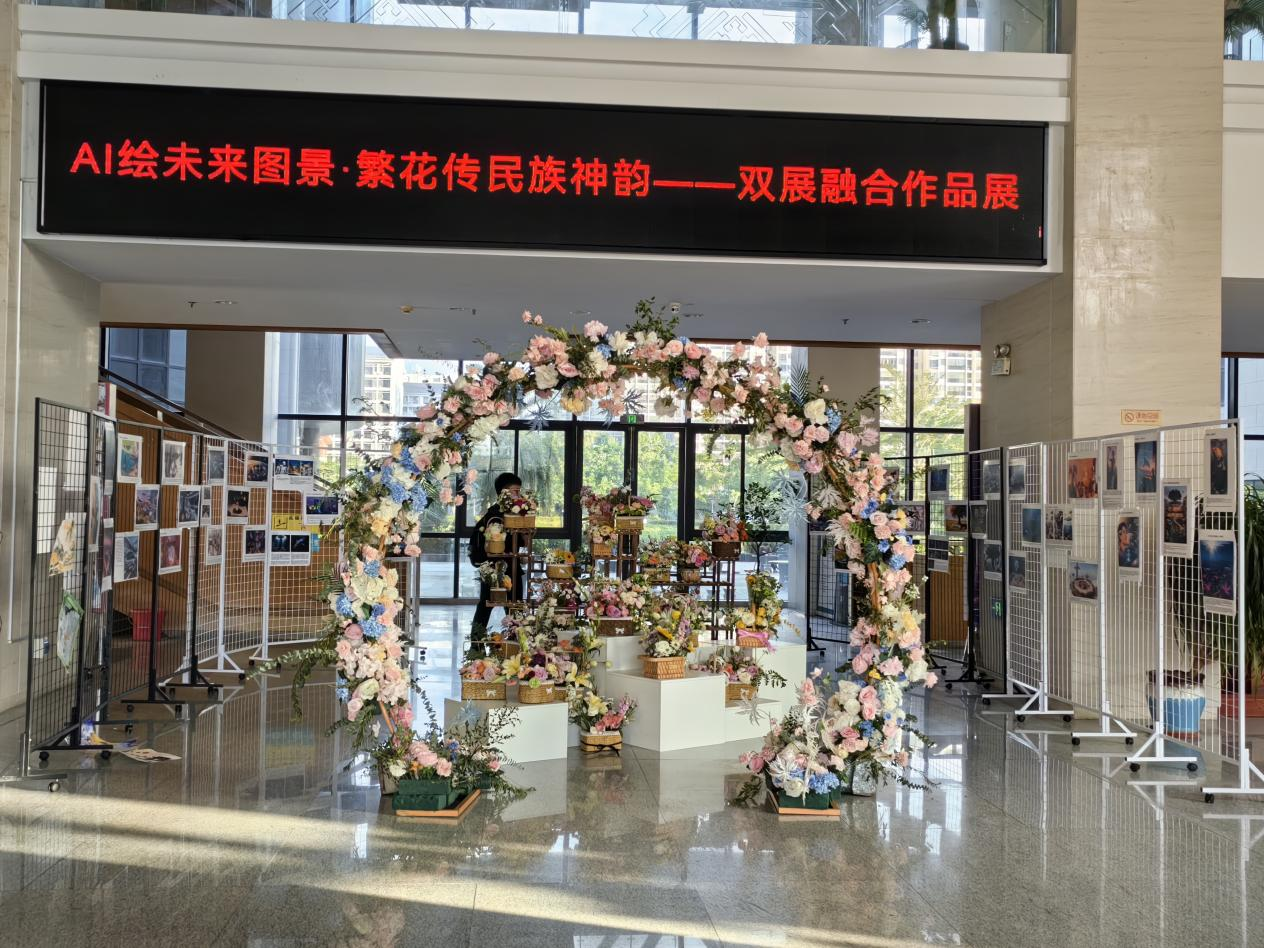本次展览共设“AI科技绘图”与“传统插花艺术”两大板块,以“科技与传统共生、创意与美育相融”为主题,集中呈现学生AI绘画作品与师生插花艺术创作。展出的近百件AI作品构思巧妙,既有融合海南热带风情与未来科技的奇幻画面,也有将黎锦纹样等本土文化元素与赛博朋克风格相结合的创新尝试。这些作品均由学生借助AI技术平台实现创意,展现出我校学子对未来的多元想象与技术运用能力。而插花艺术展区,师生以花为媒,融入虚实相生的东方美学,巧妙结合黎族编织的对称韵律与海洋文化的灵动意象,引领观众在花香雅韵中沉浸体验传统文化的当代魅力。